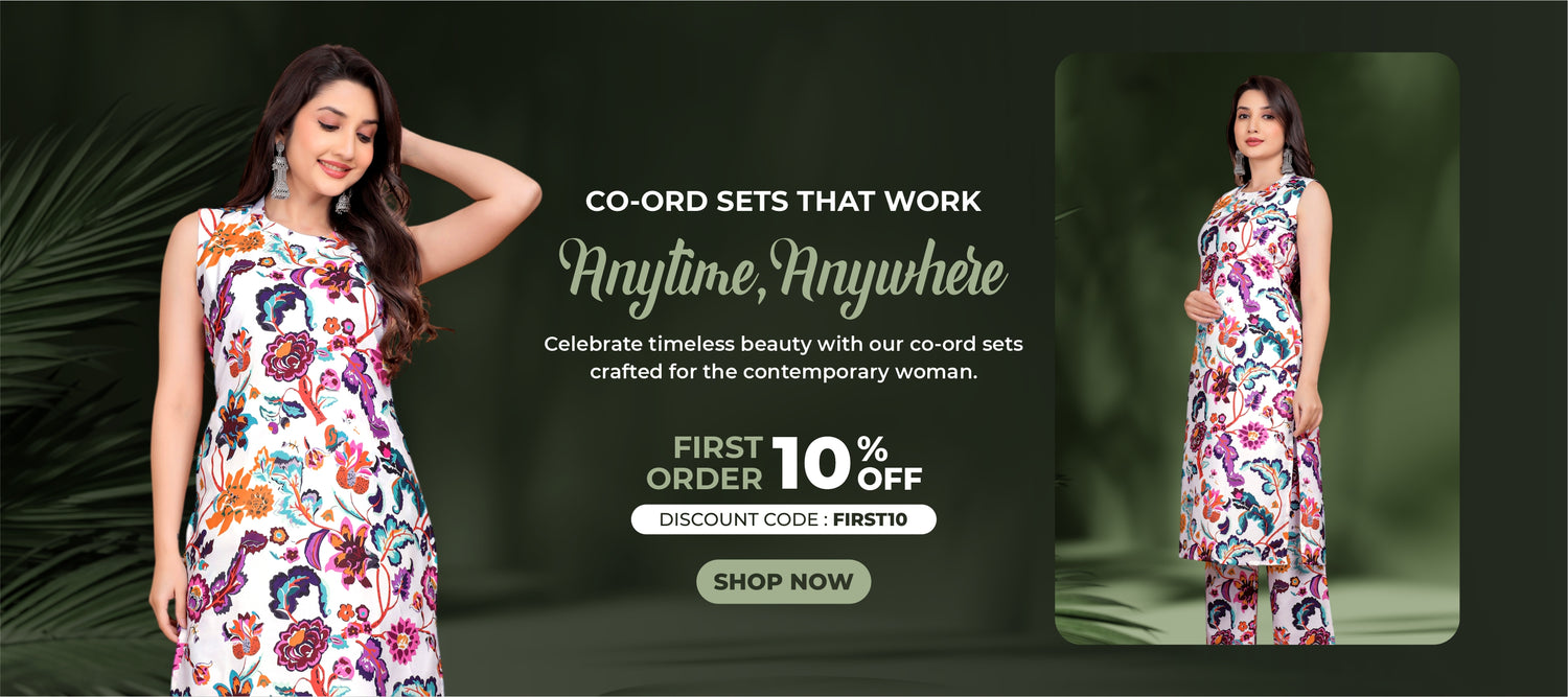 Our Coโord Sets, Tops & Tunics, Kutri Sets, Short Kurtis, and Gowns range from versatile cropped and midโthigh styles to elegant oneโpieces with ethnic flair - perfect for everything from everyday wear to festive and formal occasions.