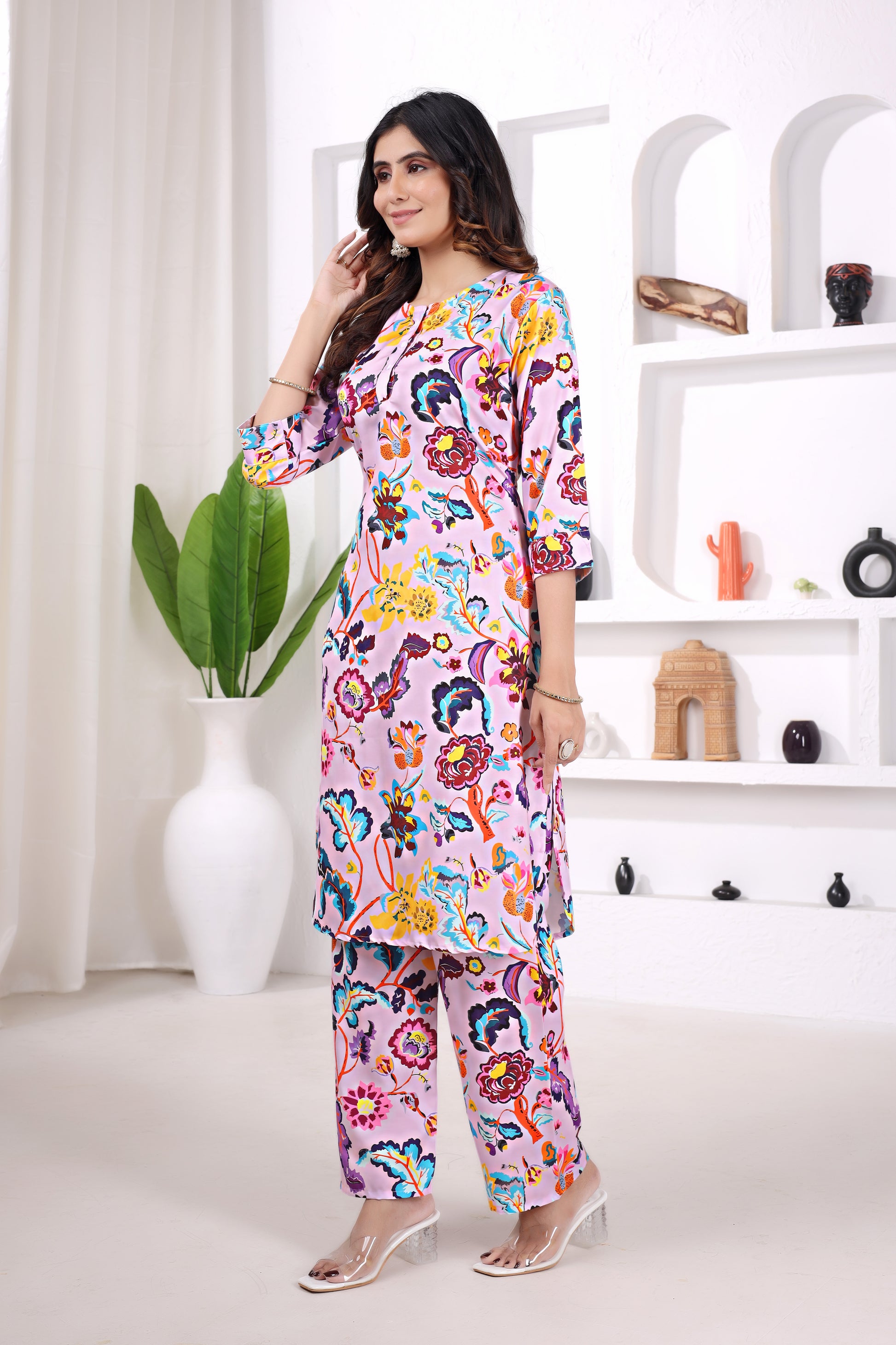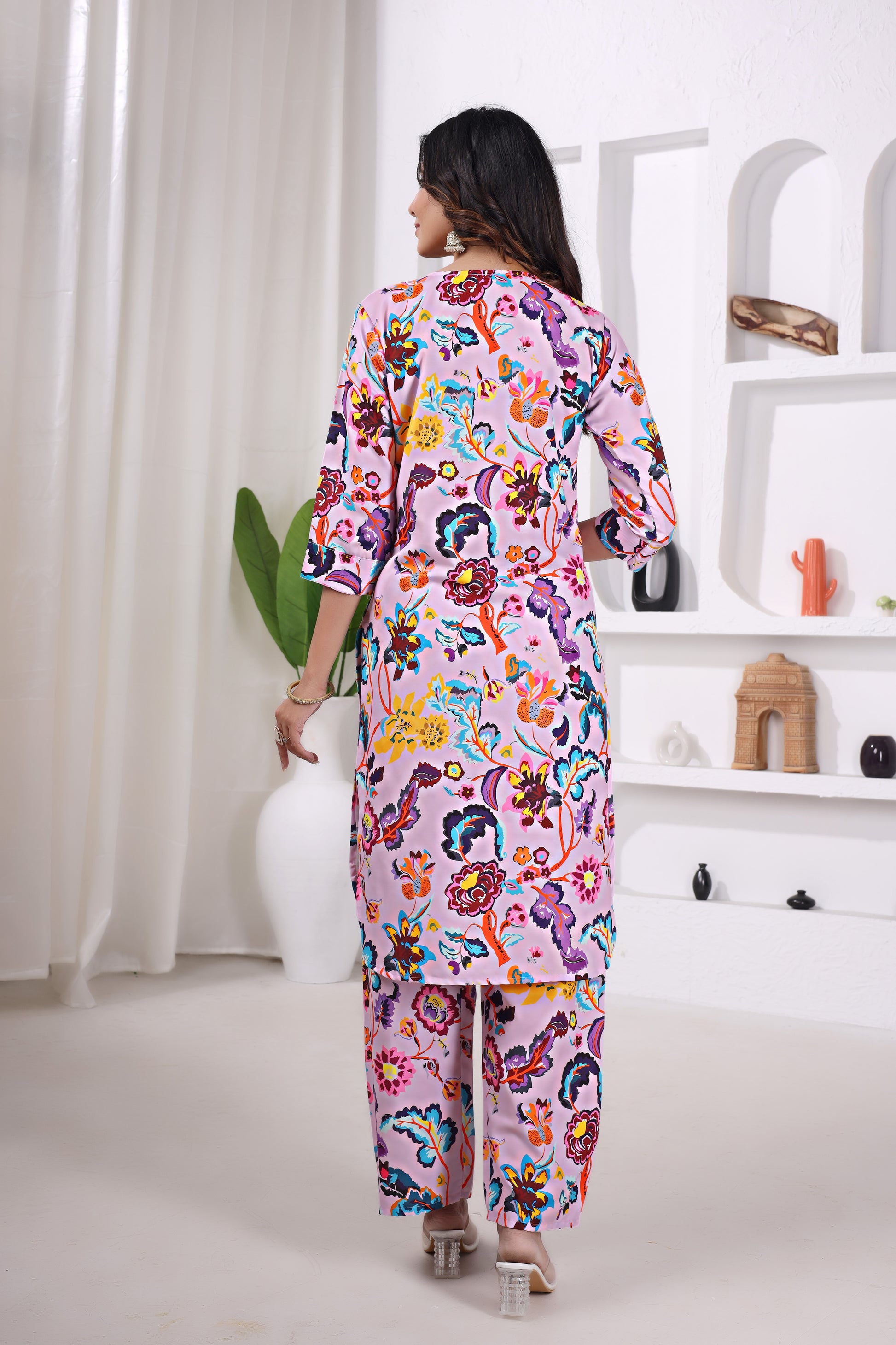 Pastel Pink Multicolor Printed Kurta Set with Matching Pants in Viscose Rayon