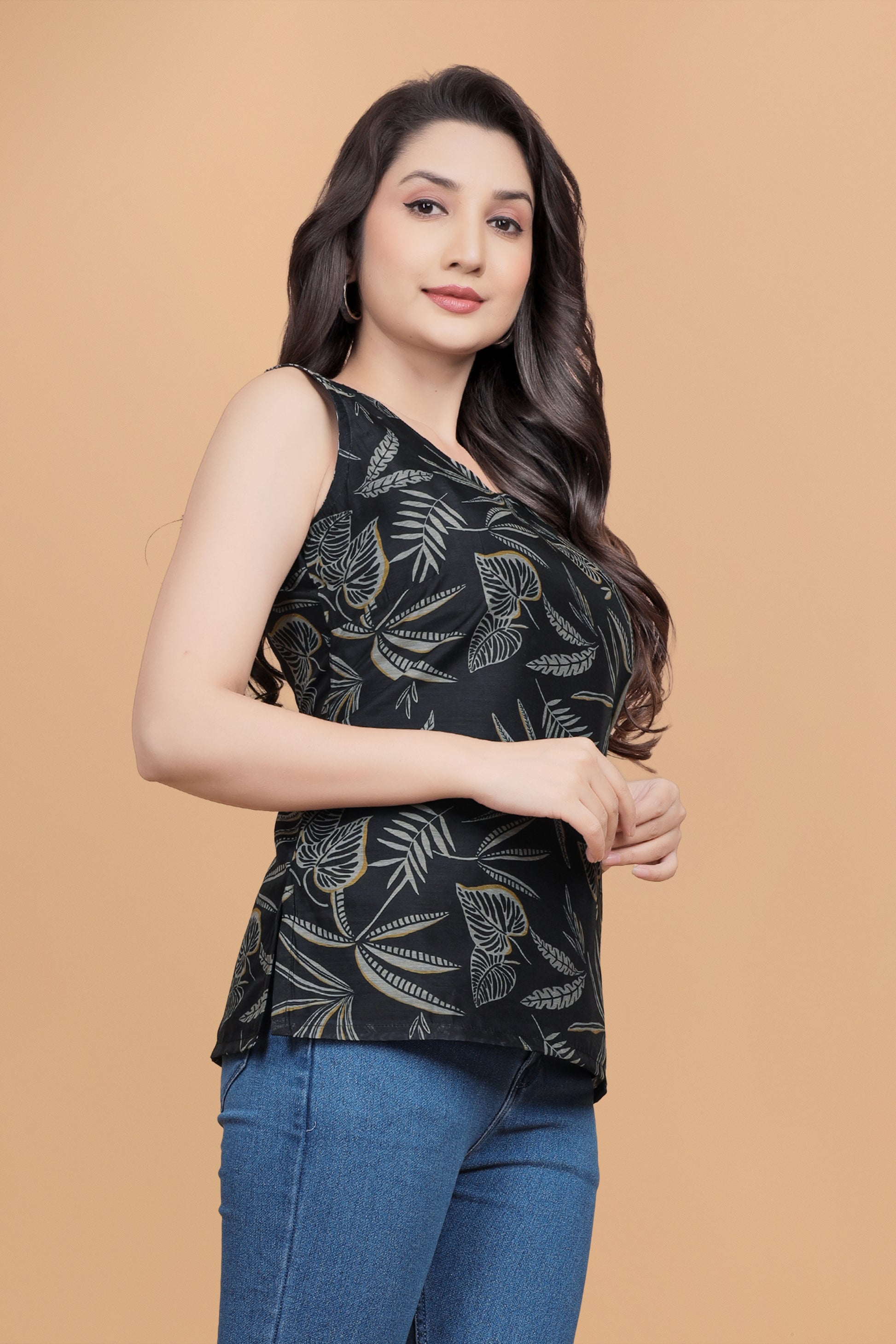 Women's Black Floral Printed Sleeveless Top in Rayon Slub Fabric